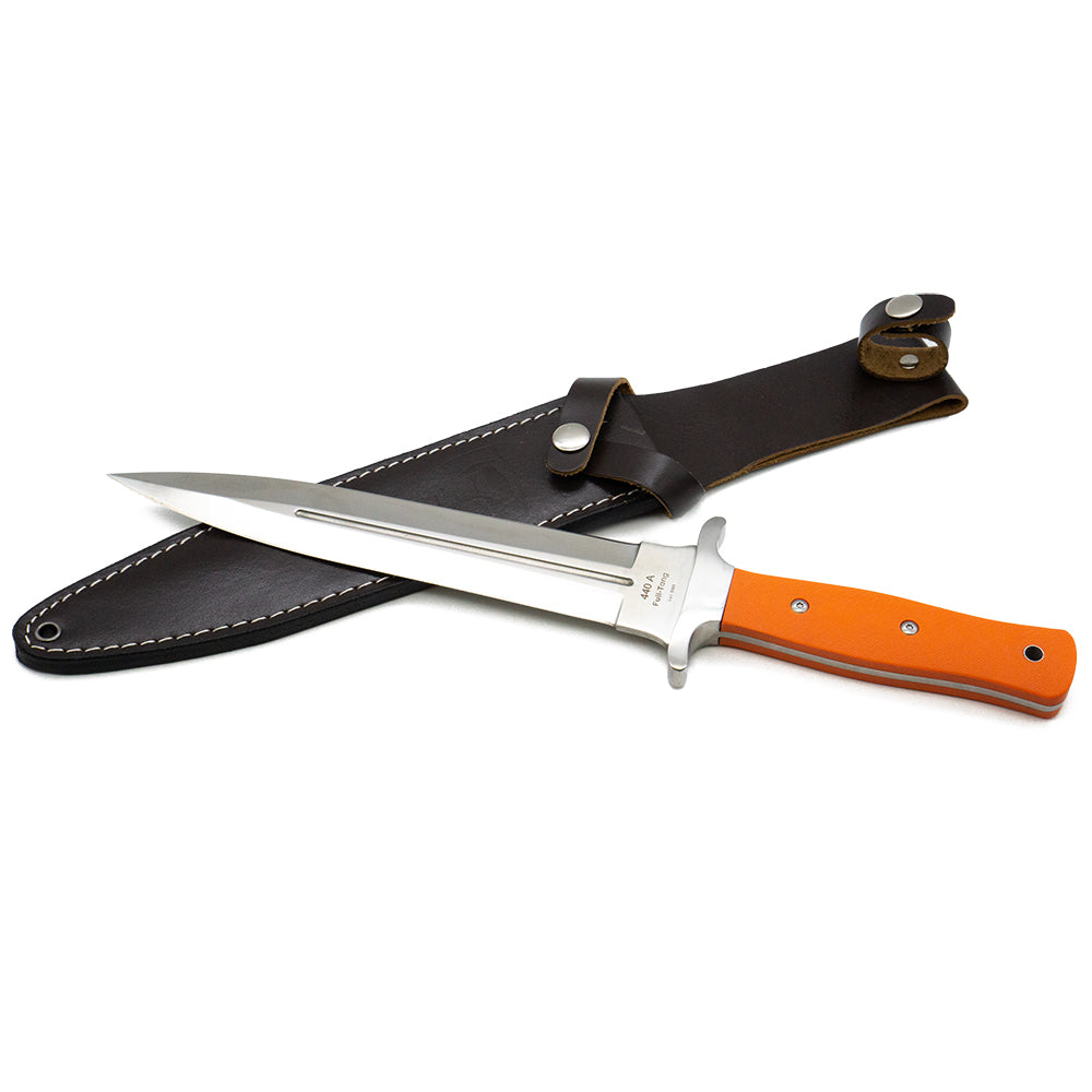 Das Parforce Messer Boar Hunter verfügt über eine 4 mm starke beidseitig geschliffene Klinge mit Hohlkehle. Griffschalen aus orangem G10 und sichere Parier Elemente runden sein Design ab. Inklusive Lederscheide.